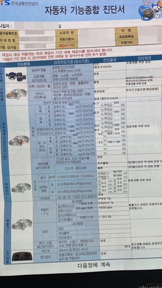 아무래도 예약 시간보다 미리 도착하는 것이 좋습니다. 접수처에서 예약을 확인하시고 차량을 검사소 입구로 옮겨 놓고 고객 대기실에서 쉬고 있으면 한 20분 ~ 30분 후 직원들이 검사를 마치고 차량 번호와 함께 호출을 해줍니다. 그리고 검사 결과인 진단서를 받게 됩니다. 많은 항목들에 대한 검사가 진행되었고 기능 정상 여부를 판단해서 보입니다. 보기 어려워도 진단서를 보면서 직원분께서 차량의 검사 결과와 이상 유무에 대해서 친절하게 설명해주시니까 걱정은 안 하셔도 됩니다.