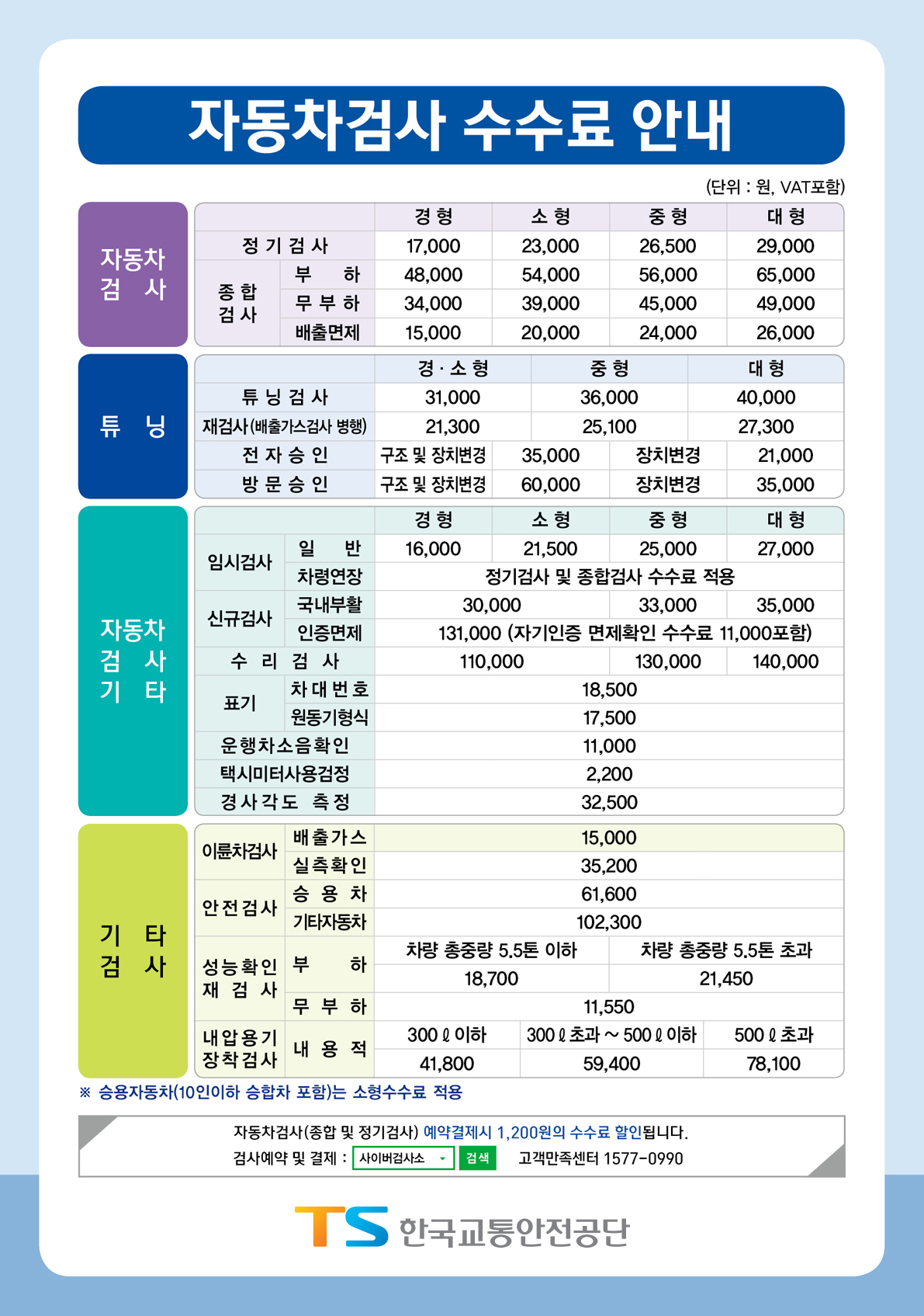 검사수수료는 검사 종류, 차종별로 다르며, 검사수수료 감면은 결제하기 단계에서 적용 가능합니다. 정보사용 및 SMS 수신동의 1. 개인정보의 수집·이용 목적 : 자동차검사 기간안내(문자&알림톡), 유선안내, 고객만족도 조사 등 2. 수집하는 개인정보의 항목 : 자동차등록번호, 생년월일, 휴대폰번호 3. 개인정보의 보유·이용 기간 : 정보주체의 삭제 요청 시까지 4. 귀하는 위와 같은 개인정보 수집·이용에 동의하지 않으실 수 있습니다. 동의 거부 시 자동차