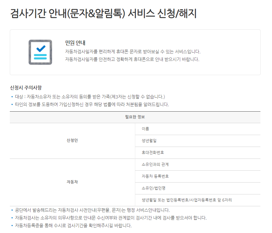 검사기간 안내(문자&알림톡) 서비스 신청/해지 민원 안내 자동차검사일자를 편리하게 휴대폰 문자로 받아보실 수 있는 서비스입니다.자동차검사일자를 안전하고 정확하게 휴대폰으로 안내 받으시기 바랍니다. 안내 보기 --> 신청시 주의사항 대상 : 자동차소유자 또는 소유자의 동의를 받은 가족(제3자는 신청할 수 없습니다.) 타인의 정보를 도용하여 가입신청하신 경우 해당 법률에 따라 처분됨을 알려드립니다. 자동차 검사기간 SMS 서비스 신청에 필요한 정보 리스트 필