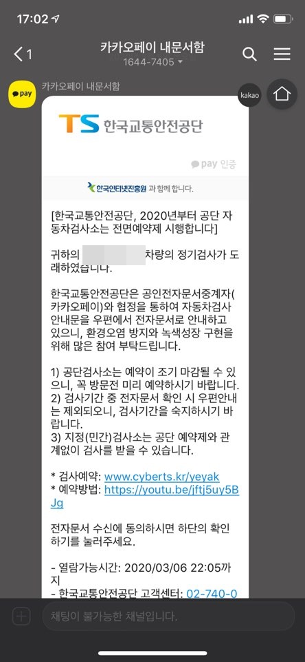 저의 경우는 카카오톡으로 바로 알림이 왔는데요. 따로 신청한 적은 없는데 TS한국교통안전공단과 카카오페이가 협정을 통해서 자동차검사 안내문을 우편에서 전자문서로 안내한다고 하더라고요. 환경도 생각하고, 편하기도 엄청 편해요. 스마트폰으로 바로 예약하고 결제까지 가능해서 정말 편했어요.