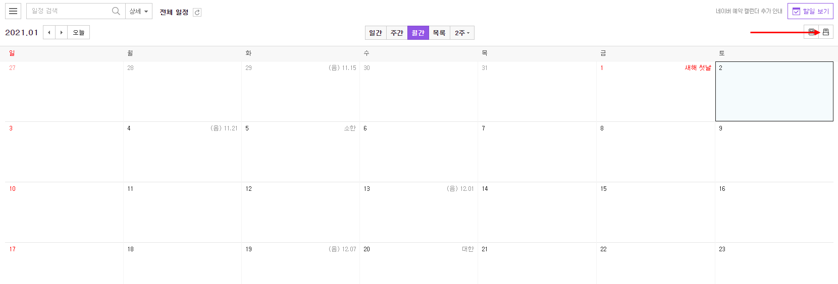 네이버 캘린더 화면으로 진입하시면 달력 상단 우측에 프린터 아이콘이 조그맣게 있는데요. 그 버튼을 누르면 인쇄를 진행하실 수 있습니다.