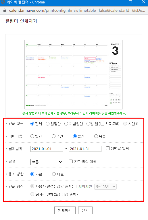 A4용지 기준으로 1장이 1개월이 되는 것이구요, 12개월을 전체 출력한다면 당연히 A4용지 12장이 필요합니다. 용지 방향 가로 / 세로는 달력의 방향을 선택하는 것입니다.