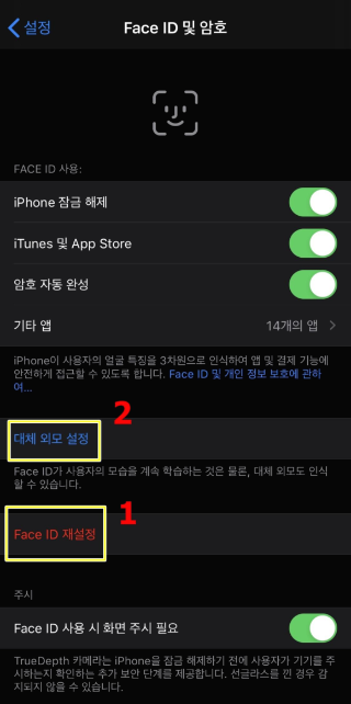 3. 위 사진에 1번 [Face ID 재설정]을 통해 기존 페이스 아이디를 지우고 새로 등록을 하시면 됩니다.