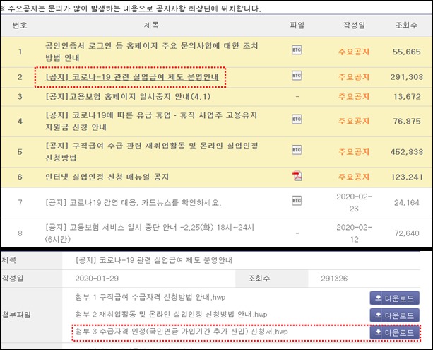 방법은 고용보험 홈페이지 > 공지사항 > 게시물 중 상단의 "코로나 19 관련 실업급여 제도 운영 안내 > 게시물 첨부 파일의 3번 '수급자격 인정(국민연금 가입기간 추가 산입) 신청서' 한글 파일 다운로드 > 작성 > 출력