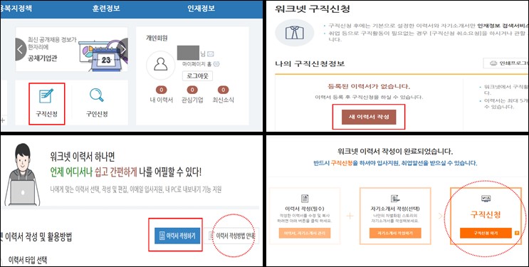 2) 구직신청 클릭 > 새로운 이력서 작성 (자소서는 선택사항) > 구직신청을 완료해주세요.